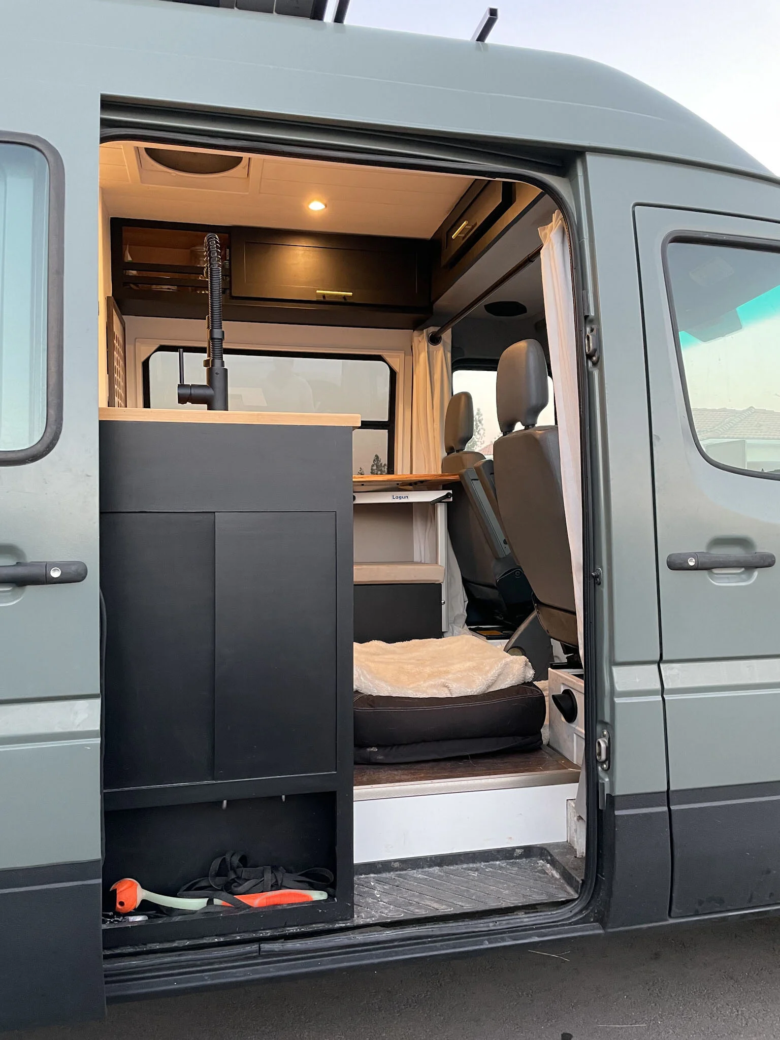 One of our favorite parts of the van, that wasn’t shown in our sketch up model, is our cabinet design that sticks out into our sliding door. This cabinet was planned with lots of dog friendly elements in mind. We attached two hooks for removable dog leashes so the pups could be safely clipped in while we might be in the van doing something else. Not everywhere is off leash friendly either, which makes this area really convenient for campgrounds. Also in our sliding door, we have a sprayer to wash off the dogs before they enter the van. We’re able to choose hot or cold water, so it’s suitable for reluctant dog baths in every season. The little area that’s safe and snug inside the van (but not accessible when the door is closed) is also a perfect place for dirty shoes, dirty dog harnesses, and the poop shovel let’s be honest.
